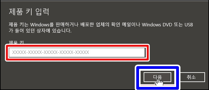 구입하신 제품 키를 입력하시고 다음을 클릭하시면