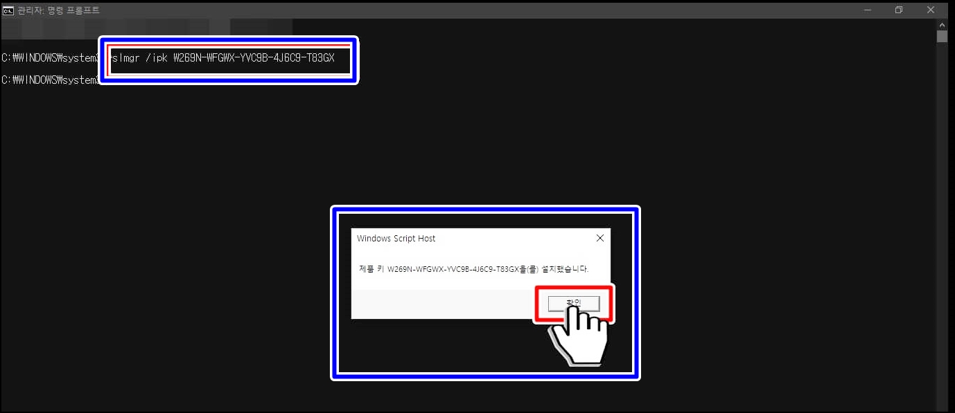 cmd창을 실행시키신 후에 slmgr /ipk W269N-WFGWX-YVC9B-4J6C9-T83GX 문자를 그대로 입력하시고 엔터를 누르시면 몇 초 후에 제품 키를 설치했다는 안내 문구가 나옵니다.