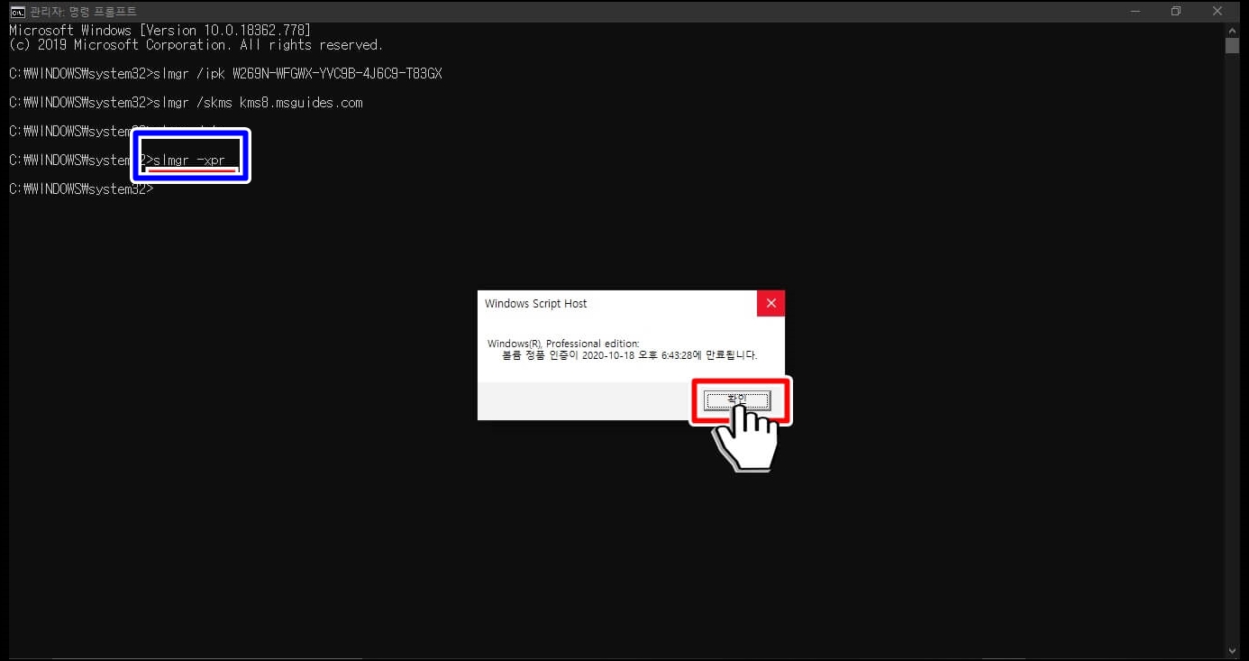 명령어 slmgr -xpr 입력해 주시면 갱신 날짜를 확인하실 수 있습니다. 갱신 날짜가 다가온다면 slmgr /ato를 다시 입력해 주시면 새로 갱신이 됩니다.